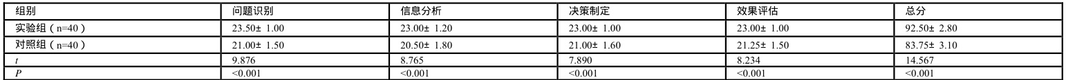 实验组临床决策能力各维度及总分均显著高于对照组,差异有统计学意义( P<0.05⋅ )。见表 4。