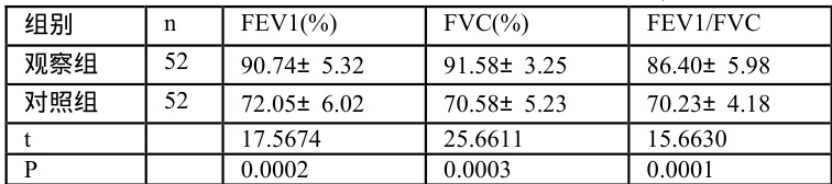 观察组FEV1、FVC 以及FEV/FVC 等心肺功能技术指标具体情况均优于对照组,差异很大兼具统计学差异 (P<0.05 ),如下表 2