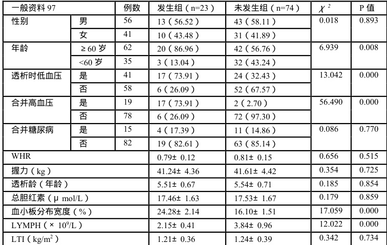 ;与年龄、透析时低血压、合并高血压、血小板分布宽度及 LYMPH 有统计差异( P<0.05; ),见表 1。