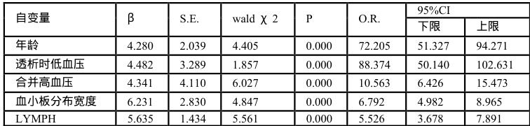 多因素 Logistic 回归结果表明,年龄、透析时低血压、合并高血压、血小板分布宽度及 LYMPH是血液透析患者心血管事件发生的影响因素( P<0.05. ),见表2。