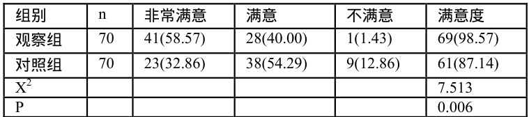 2 组对比,观察组病患的护理满意度明显高于对照组,差异很大(P<0.05 ),如表1。