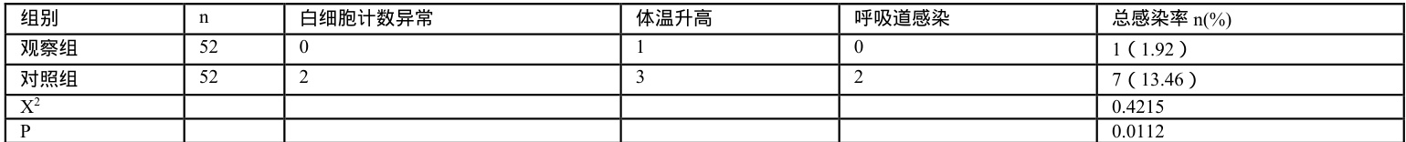 观察组患者总感染率明显低于对照组,差异显著,有统计学意义 (P<0.05) ,见表 1