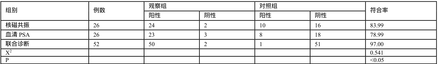 观察组病人的指标情况明显优于对照组,差异显著( P<0.05 )。见表 1 核磁共振成像和血清前列腺特异性诊断结合要较单一诊断有更高的符合率。