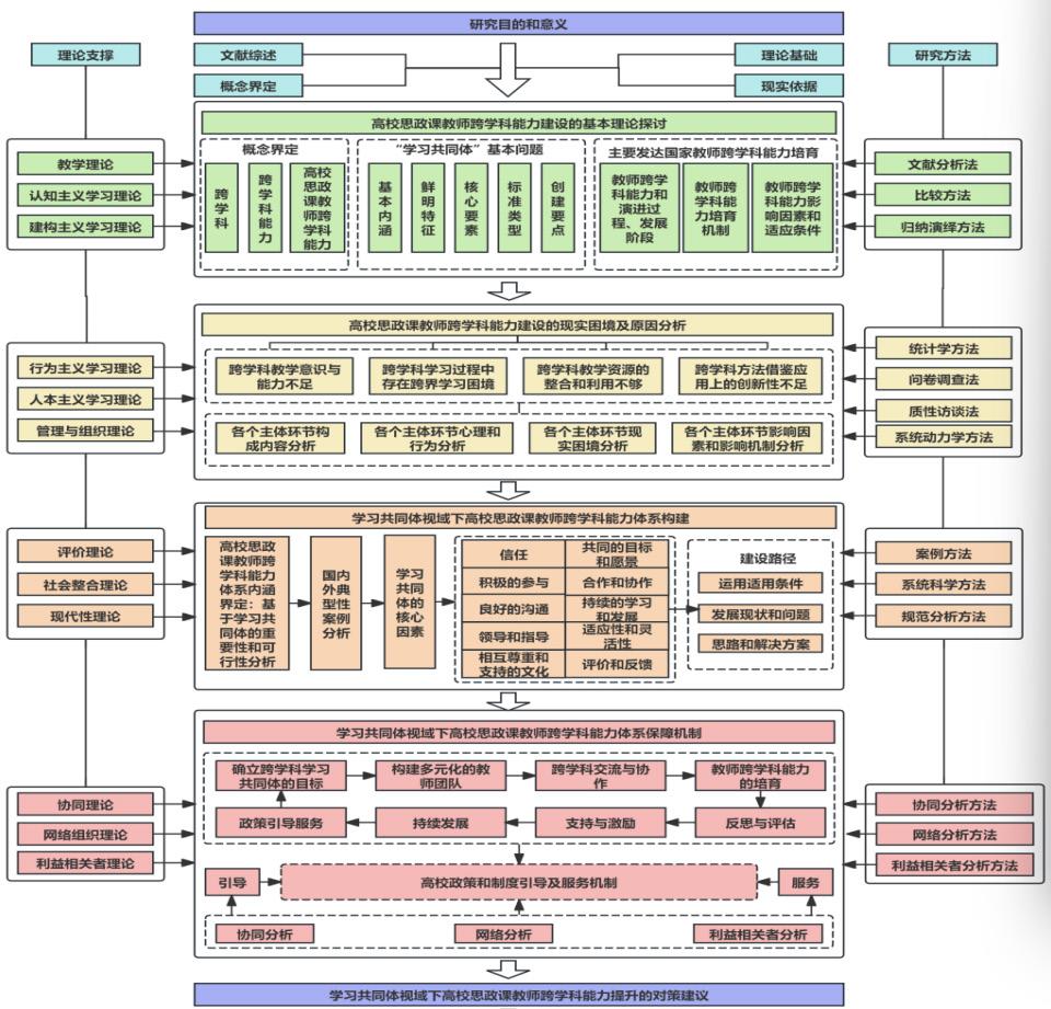 在“五育”施教活动中,高校思政课教师在学习共同体视域下,要构建提升跨学科能力体系的保障机制。一是基于学习共同体的高校思政课教师跨学科能力体系的建设,在不同环节和不同主体横向和纵向链接的一体化和链条化以及培育过程各环节的合理对接;二是通过协同分析、组织网络分析和利益相关者分析,实现基于学习共同体的全流程一体化保障机制,应有科学有效的确立跨学科学习共同目标、构建多元化的教师团队、跨学科交流与协作、教师跨学科能力的培养、反思与评估、支持与激励、持续发展和政策引导服务等保障机制。