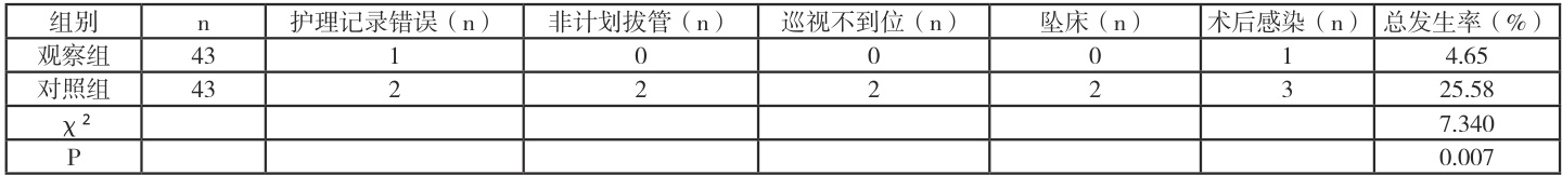 对比两组不良事件发生情况(包括护理记录错误、非计划拔管、巡视不到位、坠床、术后感染)、护理质量评分(从基础护理、沟通交流能力、护理管理态度、护理文书书写能力及消毒隔离几个方面进行评分,评分越高则护理质量越高)。