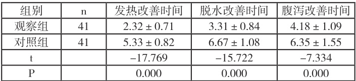 对比两组临床治疗效果(根据症状改善情况将效果分为显效、有效及无效三个等级,总有效为显效与有效之和)及症状改善时间(发热改善时间、脱水改善时间及腹泻改善时间)。