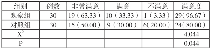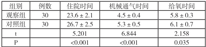 选择 2024 年 1 月至 2024 年 12 月本院接诊新生儿呼吸窘迫综合征患儿 60 例进行研究,随机分为对照组和观察组,各 30 例。对照组:男女人数 16:14,日龄 15-27( 21.3±1.5 )d。观察组:男女人数 15:15, 日 龄 16-26( 21.4±1.3 ) d 两组一般资料无显著差异,P>0.05 。