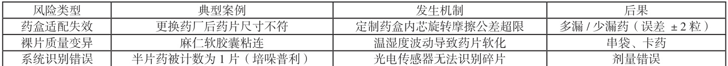 机械结构局限性制约设备普适性:药盒适配僵化导致药片尺寸或厂家变更需重制药盒,异形药片如卡托普利因体积过小无法适配,约 20% 药品仍需手工添加;裸片管理在南方潮湿环境下风险突出,大黄碳酸氢钠片吸潮板结造成串袋率高达 2.1% ,而裸片有效期缺乏统一标准易引发效期纠纷;剂型兼容性不足限制应用场景,设备仅支持片剂 / 胶囊剂,液体制剂、针剂需另购设备,增加系统复杂度与成本,具体的因技术适配问题产生的自动包药机技术风险类型与影响机制如表1 所示[9]。