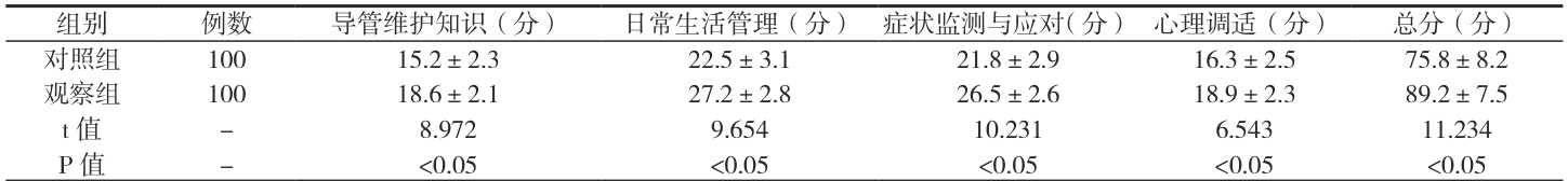 自我管理能力评分: 本研究使用我院自主研发的 PICC 置管患者自我管理能力评估量表,量表共分为导管护理知识掌握、日常生活管理、症状监测及应对、心理调适四个方面,总分 100 分,得分越高代表个体自我管理能力越强。