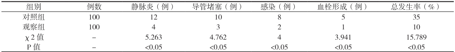 导管相关并发症发生率: 记录两组患者置管期间静脉炎、导管堵塞、感染及血栓等并发症发生情况。