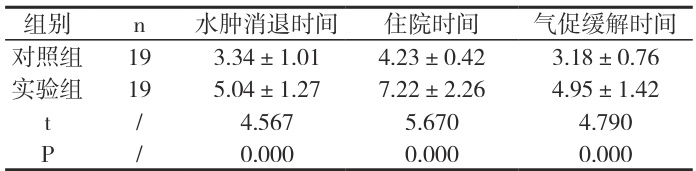 表3 水肿消退时间、住院时间、气促缓解时间(