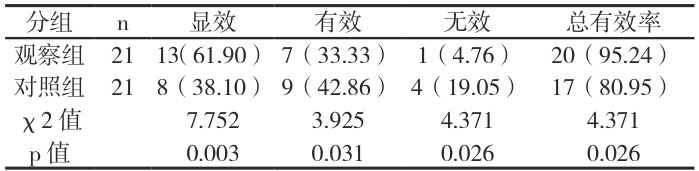 观察组总有效率 95.24% ,对照组总有效率 80.95% ( P<0.05 )。