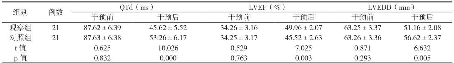 干预前两组 QTd、LVEF、LVEDD 差异小( P>0.05 ),干预后观察组QTd、LVEDD 均低于对照组,LVEF 高于对照组( P<0.05 )。