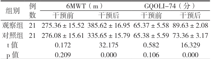 干预前两组 6MWT、GQOLI-74 评分差异小( P>0.05 ),干预后观察组6MWT、GQOLI-74 评分均高于对照组( P<0.05 )。