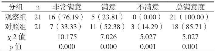 观察组总满意度 100.00% ,对照组总满意度 85.71% ( P<0.05 )。