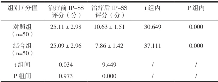2.2 对比前列腺症状改善情况结合表2 可知:治疗前两组患者的IP-SS 评分未见显著对比差异 (P>0.05) );治疗后分值均得以减小,且结合组降幅略比对照组显著,组间及组内数据差异明显 (P<0 .05)。表 2 前列腺症状改善情况对比