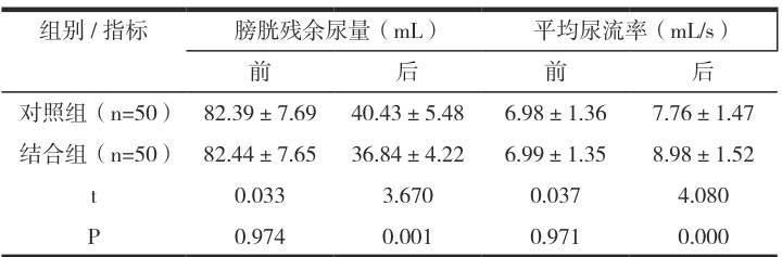 2.3 对比治疗前后尿流动力学检查结果两组患者治疗前尿流动力学检查指标未见对比差异 (P>0.05) );治疗后结合组患者略优于对照组。组间差异明显 (P<0.05) )。