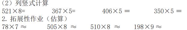 《数学课程标准》提出,要改变学生被动接受知识的学习方式,要充分发挥学生的主体作用,让学生自己去发现问题、解决问题。“双减”政策落地后,“不布置机械重复、死记硬背、过多书面作业”的现象已成为常态。单元作业作为单元教学中一个独立完整的学习活动环节,是落实“双减”政策的重要途径。因此,我们在设计单元作业时遵循以教材内容为依据,以学生发展为根本,以核心素养为导向的原则,设计多位数乘一位数单元作业案例如下: