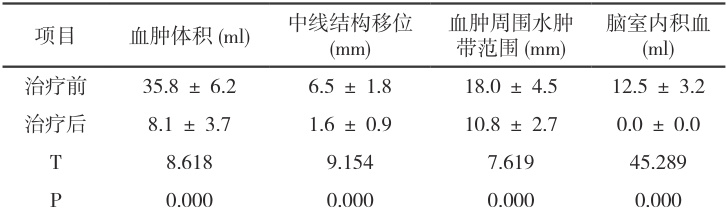 20 例患者治疗后 CT 复查显示,血肿体积由平均(35. 8±6.2 )ml 显著缩小至(8. 1±3.7⟩ )ml( ⋅P⟨0.001⟩ );中线结构移位从治疗前( 6.5±1.8 )mm 改善为( 1.6±0.9; )mm( ⟨P⟨0.01 )。所有病例均观察到血肿周围水肿带范围缩小(平均减少 >40% ),破入脑室患者的脑室内积血吸收率达 100% 。治疗前后影像学指标的统计学差异均显著( ⋅P⟨0.05⟩ ),详情见表1。