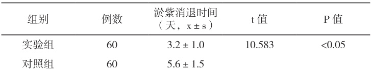 实验组患者淤紫消退时间为( 3.2±1.0 )天,对照组患者淤紫消退时间为(5.6±1.5)天。实验组患者淤紫消退时间明显短于对照组,差异具有统计学意义( t=10.583 ,