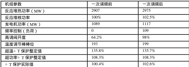 通过上表数据可以分析得出:当发生电网频率波动时,① 反应堆相关保护未触发,其中超温/超功率△ T 保护的裕度有所降低; ② 反应堆热功率将超过 102%FP (2963MW); ③ 温度调节棒上提 6步,将引起Xe 毒和△ I 振荡,极易引起功率分布畸变; ④ 频率控制补偿功率增加为109MW,高调阀开度从 64% 至约全开,将产生高幅度的油压脉动。