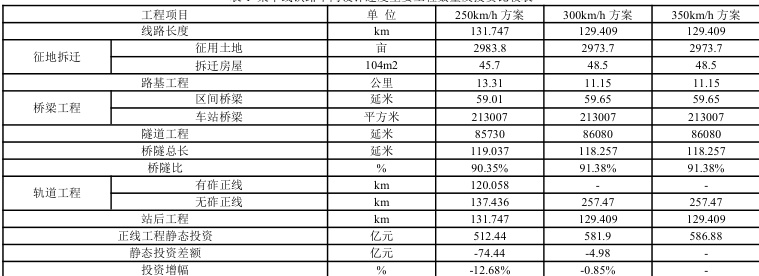表 1 某干线铁路不同设计速度主要工程数量及投资比较表