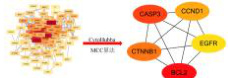 将药物与绝经后骨质疏松症靶点取交集获得93个共同靶点,导入STRING数据库(Homo sapiens,置信度≥0.7)构建蛋白互作网络,经Cytoscape 3.7.2可视化生成包含81个节点和498条边的PPI网络,采用CytoHubba的MCC算法筛选出前五位核心靶点:BCL2、CASP3、CCND1、EGFR、CTNNB1(图2)。