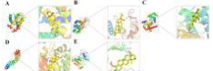 : genistein和CCND1组合相互作用模式图;D: kaempferol和CTNNB1组合相互作用模式图;E: Bursolic acid和EGFR组合相互作用模式讨论