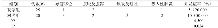 观察组导管移位、腹胀及腹泻、误吸及呕吐、吸入性肺炎等并发症率低于对照组 (P<0.05) ,见表2。