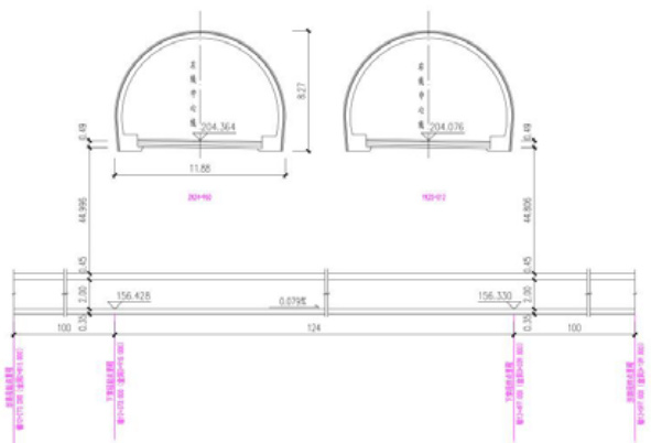 )段下穿G3(京台)高速公路大流坑隧道。输水隧洞衬后底板标高为 156.330,G3(京台)高速公路大流坑隧道左线下穿节点路面标高为 204.364,右线下穿节点路面标高为 204.076 。两隧道左右线下穿节点位置竖向净距分别为44.996m 、 44.806m