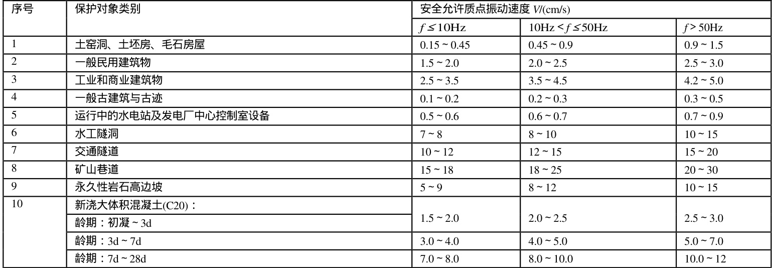 《爆破安全规程》(GB6722-2014)第 13.2 条规定,对于爆破安全允许距离及环境影响控制规定如下:地面建筑物、电站(厂)中心控制室设备、隧道与巷道、岩石高边坡和新浇大体积混凝土的爆破振动判据,采用保护对象所在地基础质点峰值振动速度和主振频率。安全允许标准如下: