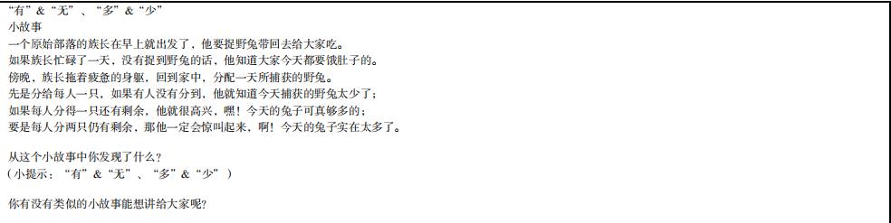 (1)第一阶段,以讲故事和互动游戏为主,辨别“ 有” 与“ 无” 、“ 多” 与“ 少”的区别。