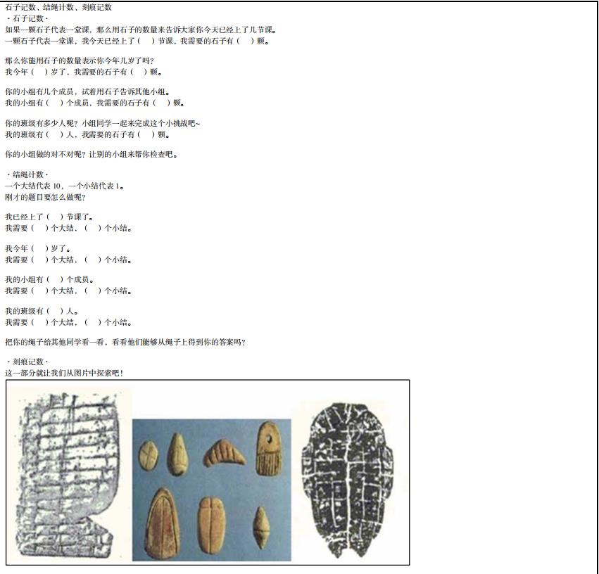 教师可将班级分成几个小组,发给他们一些小石子和绳子,然后设计一些情景。比如一颗石子代表一堂课,那么用石子的数量来告诉老师和同学你今天上了几节课,或是用石子的数量告诉大家你的年龄、你的小组有几个成员、你的班级有多少人等。然后小组之间互相检查,发现数字较大时检查所需时间较长。进而引出“ 结绳记数” ,一个大结代表 10,一个小结代表 1,再来重复刚才的场景。比较所需时间以及难易程度,讨论石子记数与结绳记数之间的区别。刻痕记数因为不易操作,故由教师用图片的形式展示给学生。
