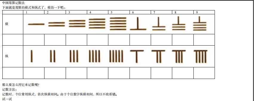 首先是熟悉横式和纵式的写法。让学生试着模仿,之后练习看到可以认出是哪个数字,最后尝试着自己书写。在练习的过程中,引导学生去思考纵横相间的好处,再以102 和 10002 为例,让学生在书写的过程中发现问题,进而讨论“ 0′′ 这一数学符号的重要意义。