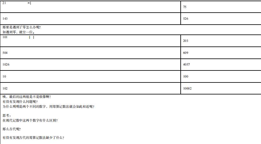 而所谓筹算,是用一种叫“ 算筹” 的运算工具来进行数字运算的方式。好比用珠算盘进行运算,叫做珠算一样。算筹是我国古代独有的一种计算工具,在明代珠算盘广泛普及之前被长期广泛运用,产生杰出的数学成果。用算筹摆出的数字有纵式和横式两种形式,记数时,个位常用纵式,依次纵横相间。由于个位数字纵横相间,所以不致看错。如遇到零,则空一位。这种记数法,实质上就是现在我们所采用的十进制位值制记数法,它用数字在数目中的位置来表示位值,从而用最少的数字符号,来最有效的表示数目。它是科学史上的一伟大发明。然而遗憾的是,中国虽最早创用十进地位制记数法,但零是采用空位表示的,起初没有专门符号。“ 0′′ ,这一记数法的关键数字,产生与印度,是现在通常使用的阿拉伯记数法的前身。