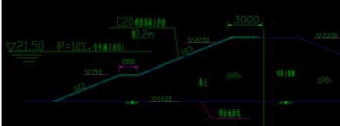 模袋混凝土护坡工程位于乌沙河泵闸枢纽工程全年上、下游横向围堰(全年上游横堰0+000.000~全年上游横堰 0+104.69. 、全年下游横堰 0+000.000 ~全年下游横堰 0+085.23 )临水面,确保岸坡不会受到水位的影响。模袋混凝土护坡的顶高程 EL23.0m(为堰顶高程,延伸长度 3m),岸坡段底高程为现状地面线,河床段底高程为河床基础块石挤淤顶高程,现该区域的水位高程 14.0m。该段护坡坡面主要由2 段 1:2.5 坡面连接 2m 宽马道组成,模袋的覆盖面积 6950 ㎡,厚度为20cm,袋内灌注标号为 C20 混凝土。