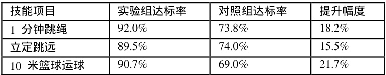 实验为期一学期(16 周,每周 2 节体育课),期末对两组学生进行三项技能复测,结果如下: