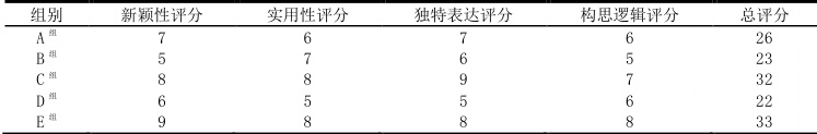 E 组在所有维度上表现较为均衡,构思内容新颖,具备较强的实用导向与完整的表达结构;C 组在独特表达上得分较高,创意语言鲜明,构思路径清晰;A 组与B 组在新颖性与逻辑性之间存在波动,反映其创意亮点不够稳定或结构组织不够清晰;D 组表现相对一般,说明其构思存在常规化倾向,缺乏差异化特征。