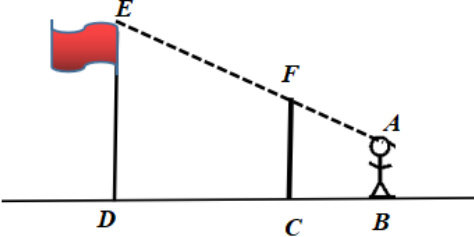 问题 2、如图,某同学与标杆顶端 F、旗杆顶端在同一直线上,已知此人眼睛距地面 1.5∗ ,标杆为3 米,且 BC=3 米,CD=10 米。求旗杆的高度。