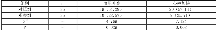 表1 可见,观察组血压升高、心率加快发生率低于对照组, P<0.05