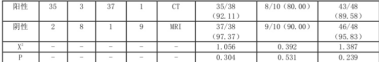 见表1 数据,CT 诊断的准确性、特异度、敏感度相较于MRI 检查,差异均不明显, P>0.05