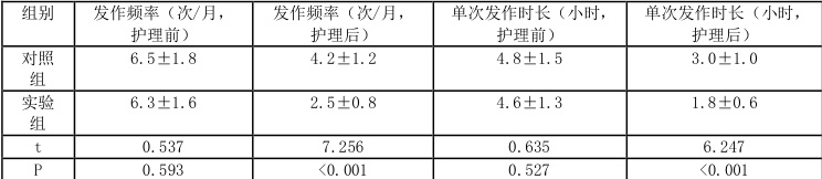 本研究结果显示,实施护理后实验组偏头痛发作频率与单次发作时长、DHI 评分显著优越于对照组,差异具备统计学价值( P<0. .05)。精细化护理干预是一种基于个体化需求的护理策略,其核心在于关注诊疗过程中的细微环节。该模式通过实施定制化的健康教育,有效提升患者对疾病认知水平和治疗方案的掌握程度,进而改善其治疗配合度;同时,针对性的心理疏导措施有助于调节患者的负面情绪状态,减轻其心理负担,从而降低心理因素对疾病预后的不良影响。