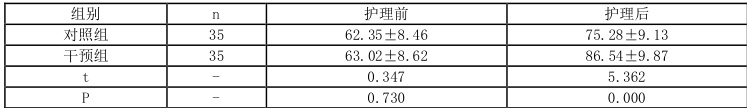 如表1 所示,护理后,干预组患者疾病相关知识掌握程度评分显著高于对照组,差异有统计学意义( (P<0.05) )。表1 两组患者疾病知识掌握程度比照 (x±s)