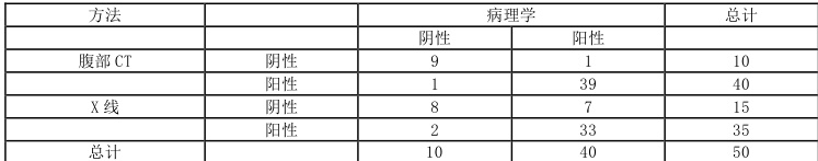 以病理学检查结果作为金标准,经腹部CT、X 线检查的诊断结果见表1: