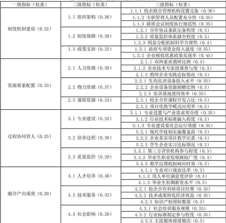 基于传统单一赋权的缺陷,首次提出使用德尔菲-层次分析(Delphi-AHP)组合赋权法来确定指标权重。在第一轮德尔菲专家咨询的基础上, 指标值;同时构建层次结构模型,通过构造判断矩阵,利用 Yaahp 软件 小于 0.1),再引入熵权法计算出信息熵权重,并用乘法合成法算出 协同育人机制”(0.33)和“资源保障水平”(0.25)权重最高,符合产 (0.05148=0.4*0.3980.33)、“校企联合技术攻关数”(0.0224=0.35*0.32*0.2 重较高,具有较强的实践指向性。