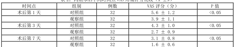 观察组术后第1、3、7 天VAS 评分均显著低于对照组 (P⟨0 .05)。见表2。