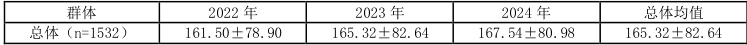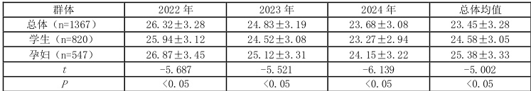 2022-2024 年总体尿碘均值呈上升趋势,学生各年份的尿碘均值显著高于孕妇 (P⟨0. 05) )。2023 年学生尿碘均值最高,2024 年孕妇尿碘均值回升,见表2。