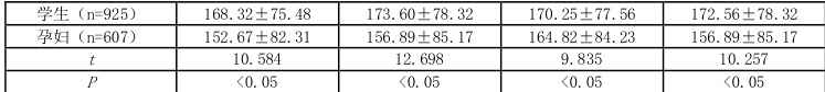 率、尿碘不足率显著低于孕妇(P<0.05),尿碘过量率显著高于孕妇(P<0.05),见表