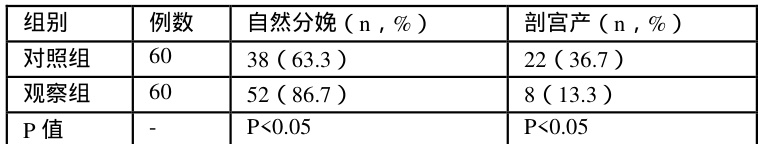 表2 观察组和对照组的自然分娩率、剖宫产率