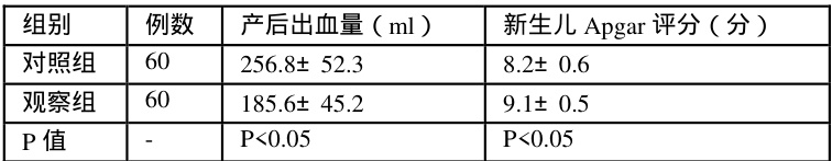 观察组产后出血量少于对照组,新生儿 Apgar 评分高于对照组,差异有统计学意义( P<0.05⋅ )。见表3。